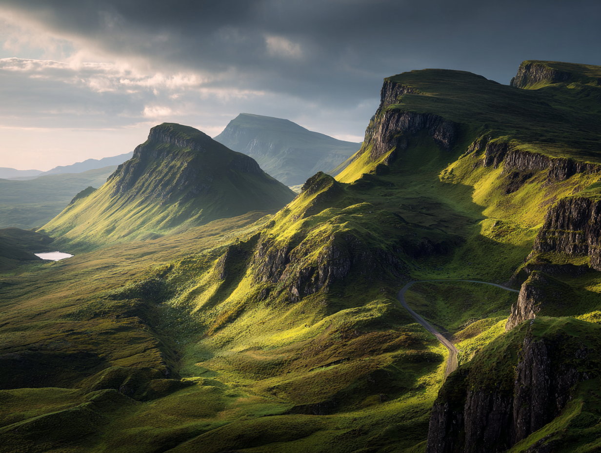 Part of the Trotternish Ridge on the Isle of Skye, the Quiraing is a dramatic landslip landscape defined by cliffs, pinnacles, and sweeping curves. The terrain is particularly striking at sunrise and sunset. While accessible by car, the narrow and winding approach roads mean advance planning is essential.
