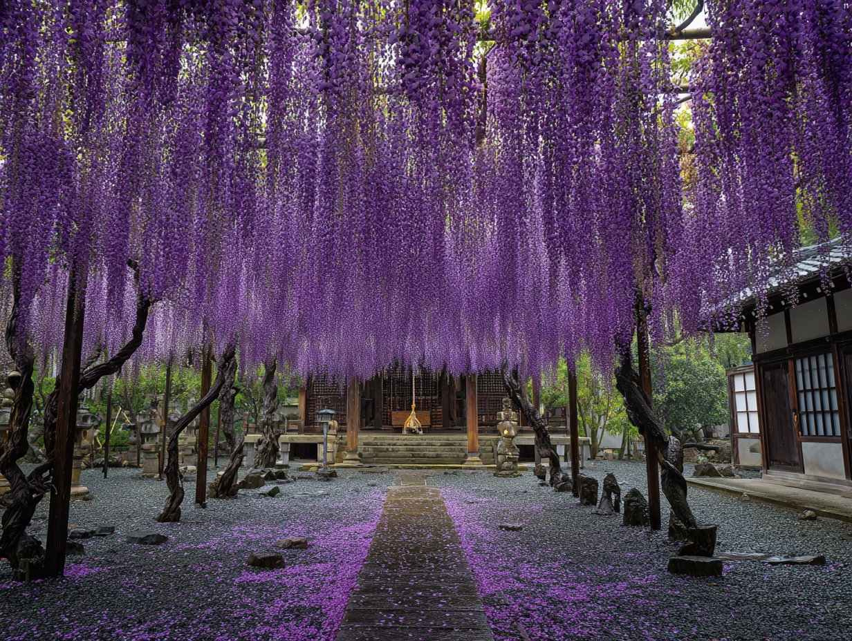 Curtains of violet bloom at Gyokoji Temple in Iwata, home to the 850-year-old Kumano Nagafuji, a nationally designated natural monument. The wisteria here are rare, known for their unusually long flower clusters that cascade downward in dramatic purple strands.