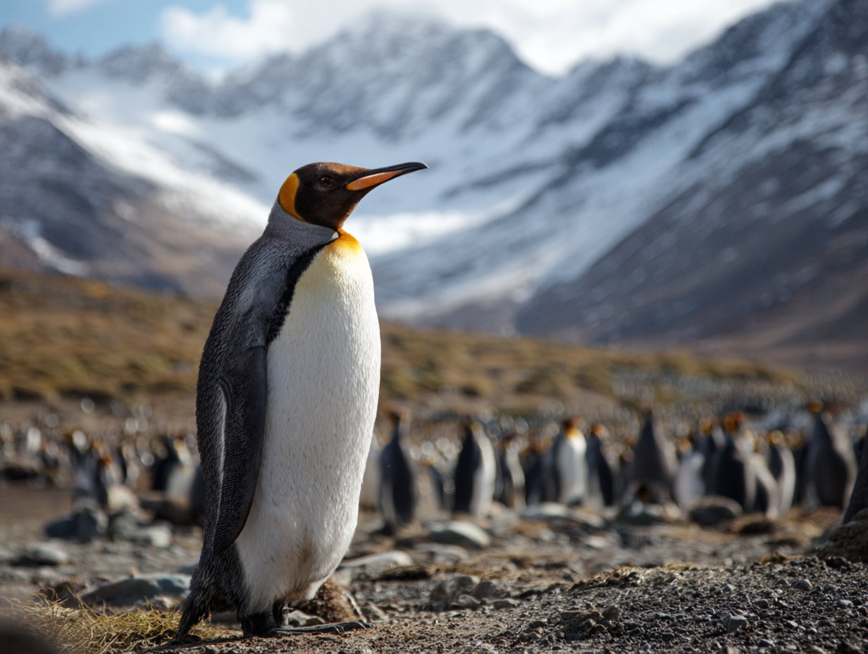 Penguins are the world’s most famous flightless birds, perfectly adapted to life in water rather than air. The king penguin, with its striking orange markings and upright posture, forms massive colonies in sub-Antarctic regions. Salisbury Plain hosts one of the largest king penguin colonies on the planet.